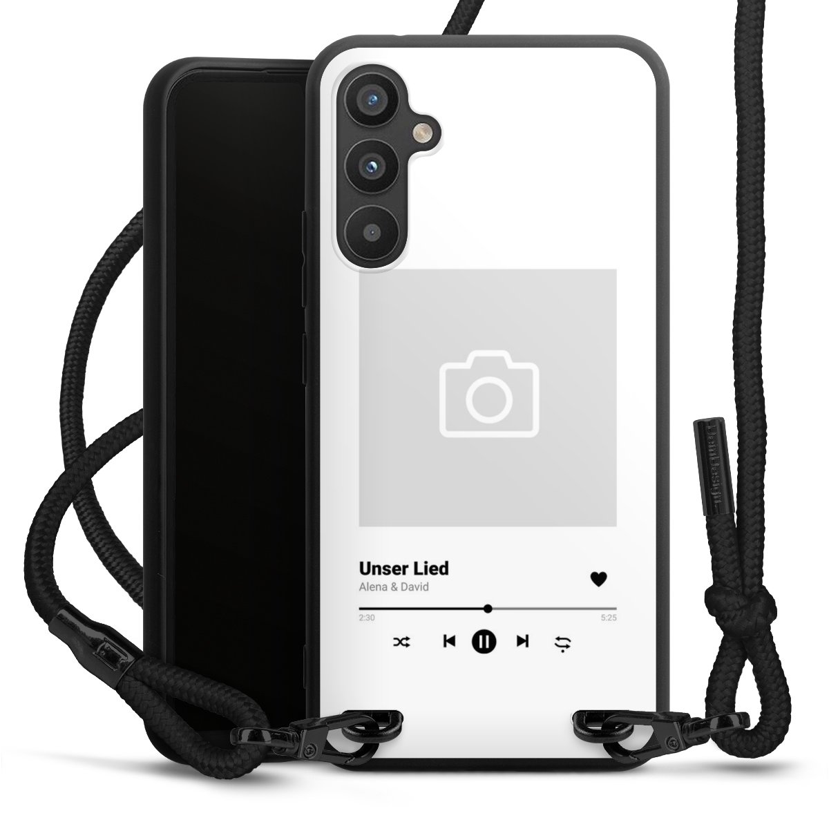 The matt black silicone case is made of flexible TPU (thermoplastic polyurethane) and offers robust protection. The durable, unbreakable material makes the cover flexible and dimensionally stable at the same time. The matte surface makes your design stand out more and is less susceptible to fingerprints and dirt. The stylish trend accessory fits comfortably in the hand and is perfectly complemented by the fabric (polyester) mobile phone strap. The braided fabric strap is approx. 1.70 metres long with a diameter of approx. 0.5 cm. Due to the special knotting technique, the length of the strap can be adjusted by simply pulling it, so that you can adapt it individually to your wishes. The practical case to wear around your neck is available with the fabric strap in black. As a little icing on the cake, we have provided the strap with a chic metal fastener in matt black. The strap is securely fastened to the case with loops made of high-quality genuine leather and press studs. The ends of the fabric strap are covered with metallic end caps and thus protected from fraying.