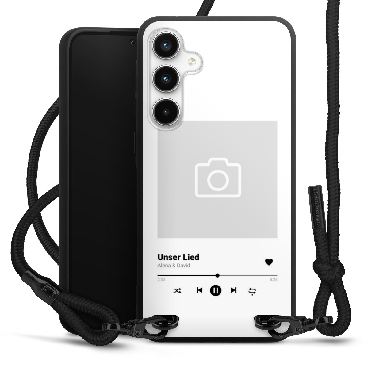 The matt black silicone case is made of flexible TPU (thermoplastic polyurethane) and offers robust protection. The durable, unbreakable material makes the cover flexible and dimensionally stable at the same time. The matte surface makes your design stand out more and is less susceptible to fingerprints and dirt. The stylish trend accessory fits comfortably in the hand and is perfectly complemented by the fabric (polyester) mobile phone strap. The braided fabric strap is approx. 1.70 metres long with a diameter of approx. 0.5 cm. Due to the special knotting technique, the length of the strap can be adjusted by simply pulling it, so that you can adapt it individually to your wishes. The practical case to wear around your neck is available with the fabric strap in black. As a little icing on the cake, we have provided the strap with a chic metal fastener in matt black. The strap is securely fastened to the case with loops made of high-quality genuine leather and press studs. The ends of the fabric strap are covered with metallic end caps and thus protected from fraying.