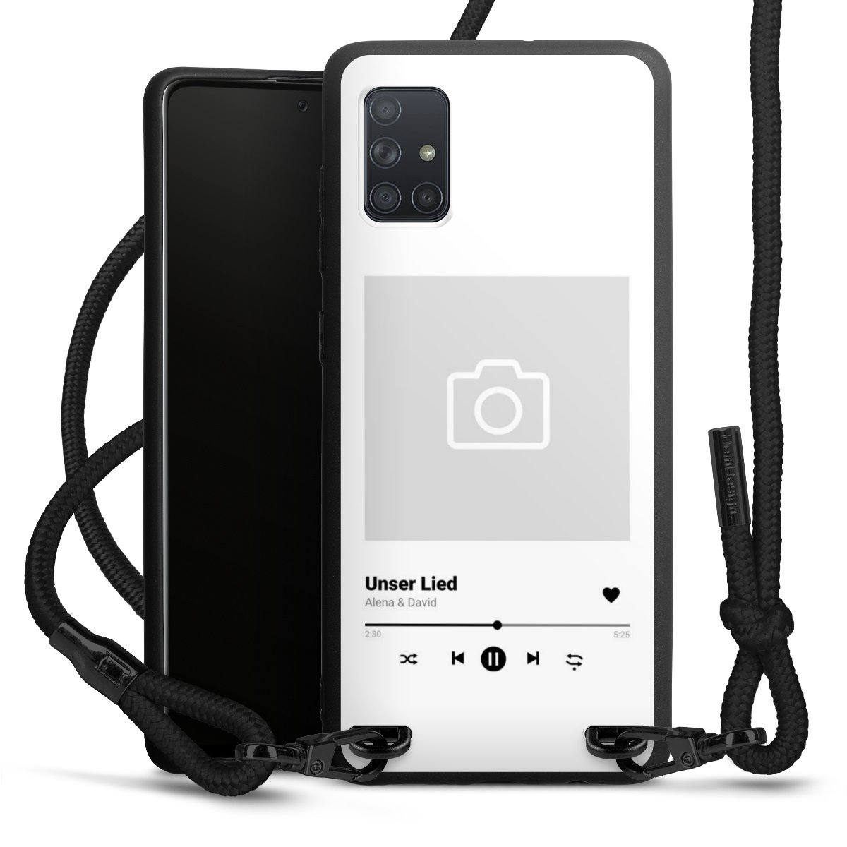 The matt black silicone case is made of flexible TPU (thermoplastic polyurethane) and offers robust protection. The durable, unbreakable material makes the cover flexible and dimensionally stable at the same time. The matte surface makes your design stand out more and is less susceptible to fingerprints and dirt. The stylish trend accessory fits comfortably in the hand and is perfectly complemented by the fabric (polyester) mobile phone strap. The braided fabric strap is approx. 1.70 metres long with a diameter of approx. 0.5 cm. Due to the special knotting technique, the length of the strap can be adjusted by simply pulling it, so that you can adapt it individually to your wishes. The practical case to wear around your neck is available with the fabric strap in black. As a little icing on the cake, we have provided the strap with a chic metal fastener in matt black. The strap is securely fastened to the case with loops made of high-quality genuine leather and press studs. The ends of the fabric strap are covered with metallic end caps and thus protected from fraying.