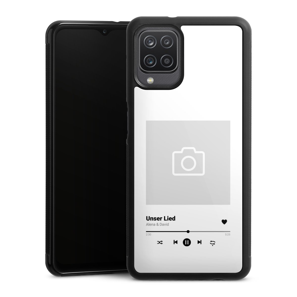 We print your design on the back of the glass inlay and then connect it firmly to the silicone case ,so that nothing sticks out and everything looks like it was cast from one piece. In addition, the sturdy glass element is protected from scratches by an additional coating and ensures a slight reflection on the shiny print image.