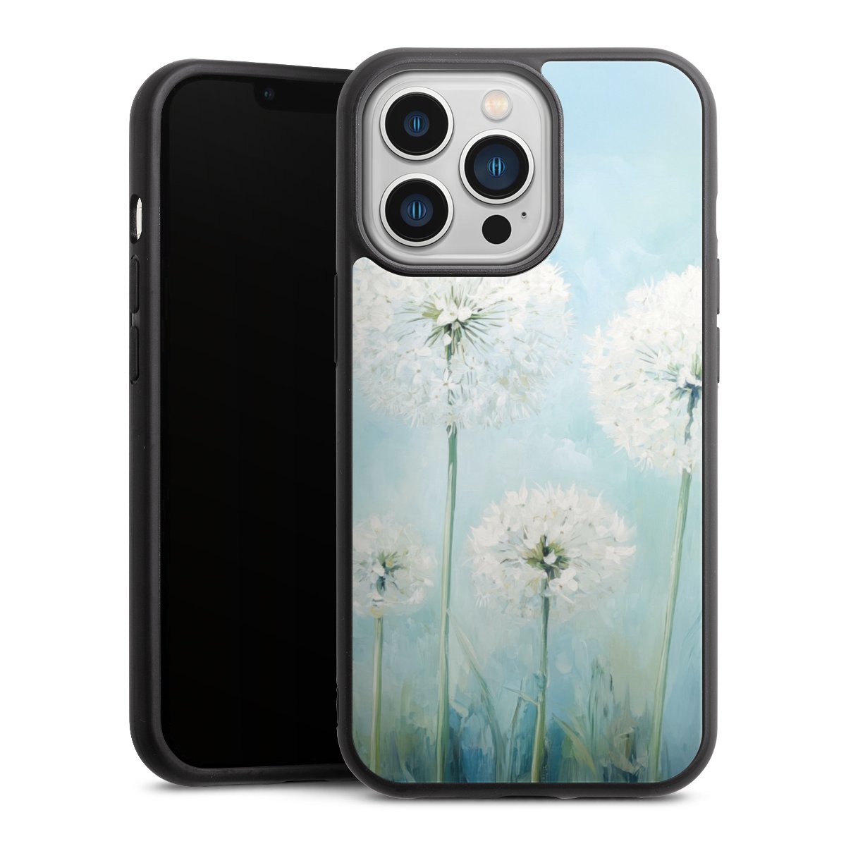 We print your design on the back of the glass inlay and then connect it firmly to the silicone case ,so that nothing sticks out and everything looks like it was cast from one piece. In addition, the sturdy glass element is protected from scratches by an additional coating and ensures a slight reflection on the shiny print image.