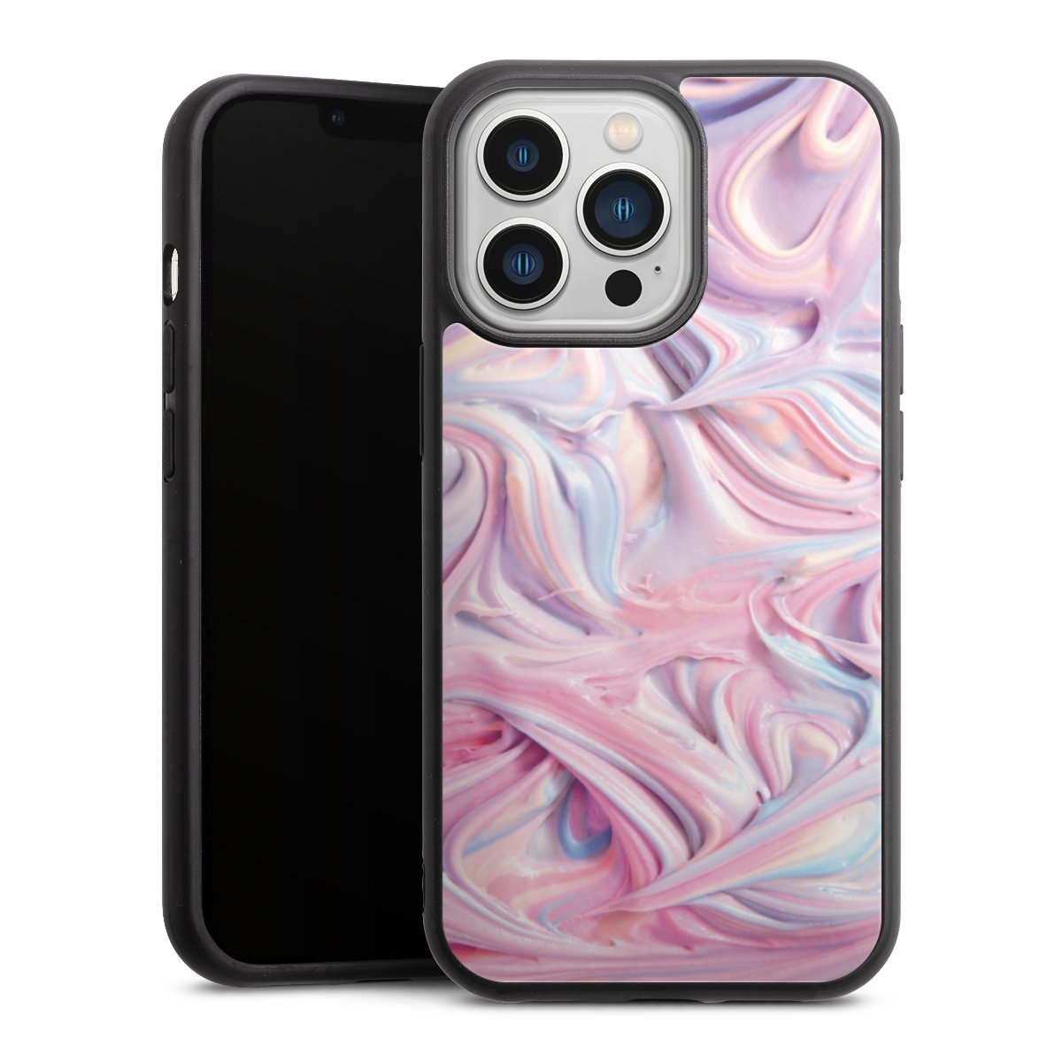 We print your design on the back of the glass inlay and then connect it firmly to the silicone case ,so that nothing sticks out and everything looks like it was cast from one piece. In addition, the sturdy glass element is protected from scratches by an additional coating and ensures a slight reflection on the shiny print image.