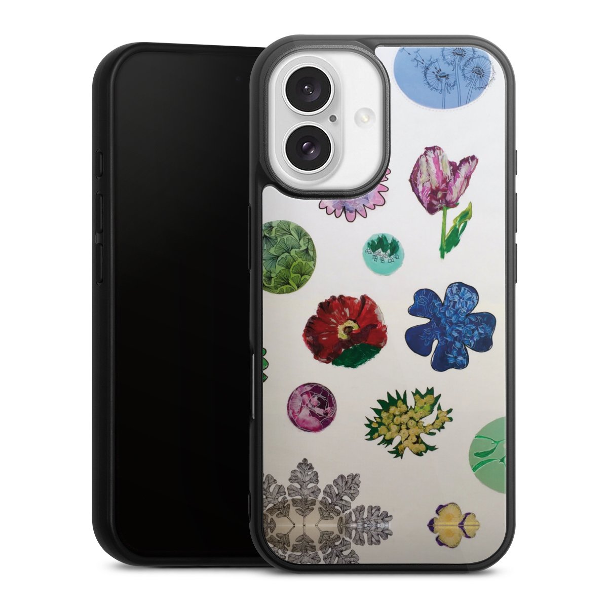 We print your design on the back of the glass inlay and then connect it firmly to the silicone case ,so that nothing sticks out and everything looks like it was cast from one piece. In addition, the sturdy glass element is protected from scratches by an additional coating and ensures a slight reflection on the shiny print image.