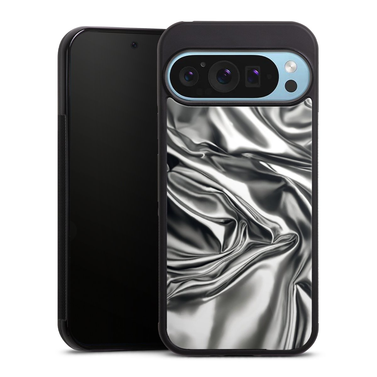 We print your design on the back of the glass inlay and then connect it firmly to the silicone case ,so that nothing sticks out and everything looks like it was cast from one piece. In addition, the sturdy glass element is protected from scratches by an additional coating and ensures a slight reflection on the shiny print image.