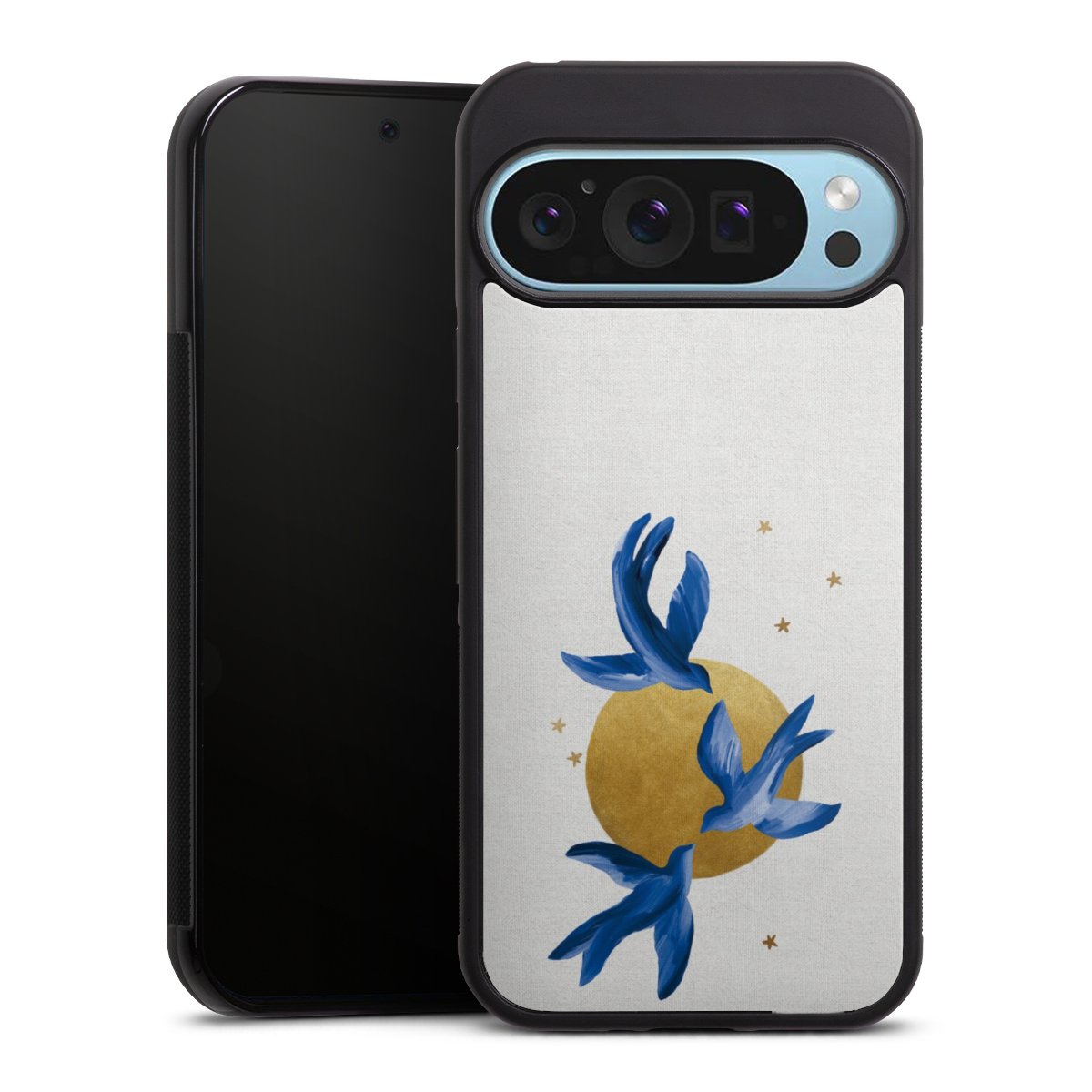 We print your design on the back of the glass inlay and then connect it firmly to the silicone case ,so that nothing sticks out and everything looks like it was cast from one piece. In addition, the sturdy glass element is protected from scratches by an additional coating and ensures a slight reflection on the shiny print image.