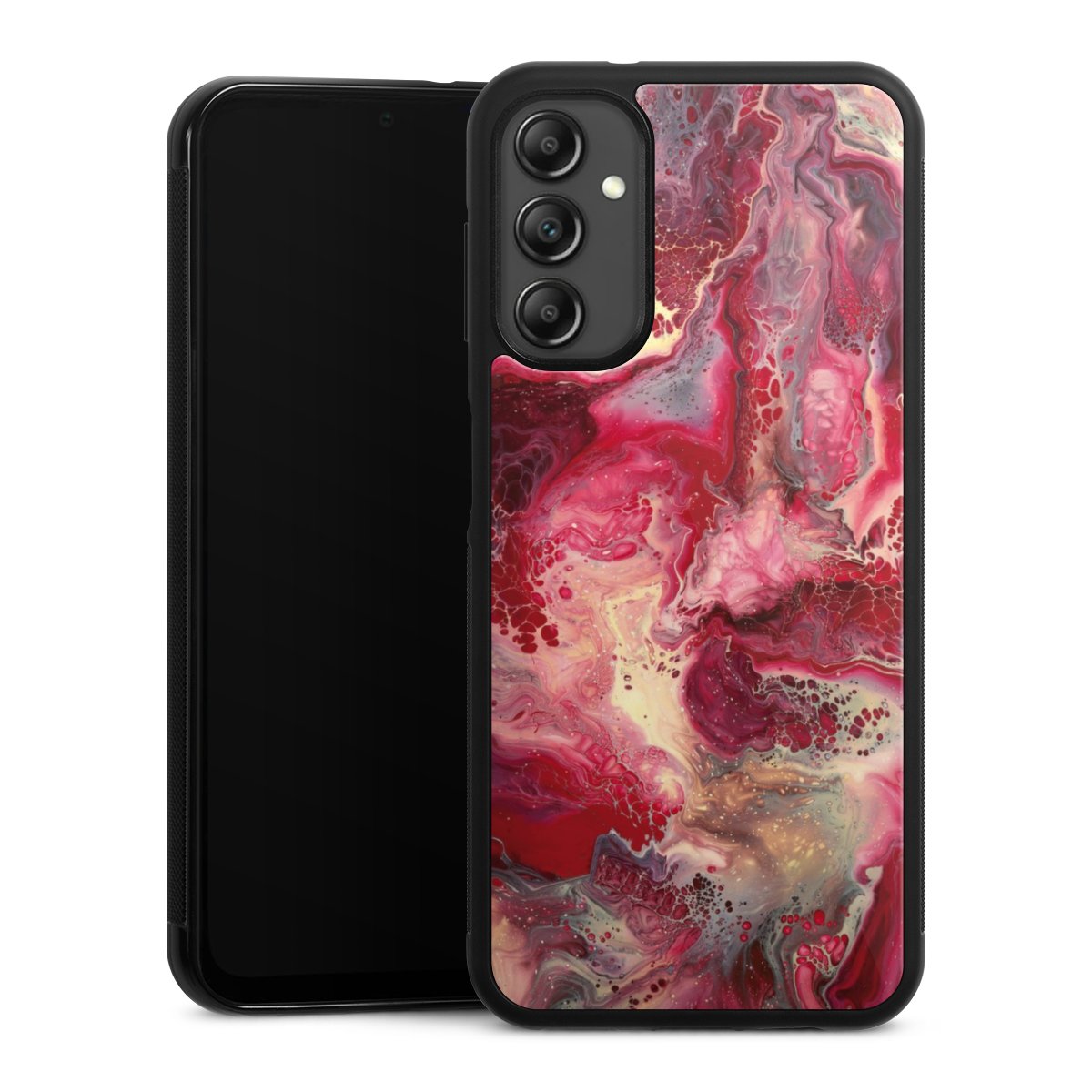 We print your design on the back of the glass inlay and then connect it firmly to the silicone case ,so that nothing sticks out and everything looks like it was cast from one piece. In addition, the sturdy glass element is protected from scratches by an additional coating and ensures a slight reflection on the shiny print image.