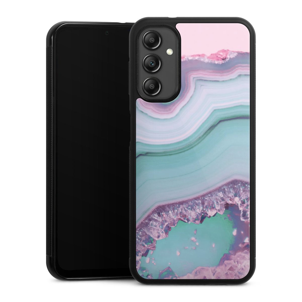 We print your design on the back of the glass inlay and then connect it firmly to the silicone case ,so that nothing sticks out and everything looks like it was cast from one piece. In addition, the sturdy glass element is protected from scratches by an additional coating and ensures a slight reflection on the shiny print image.
