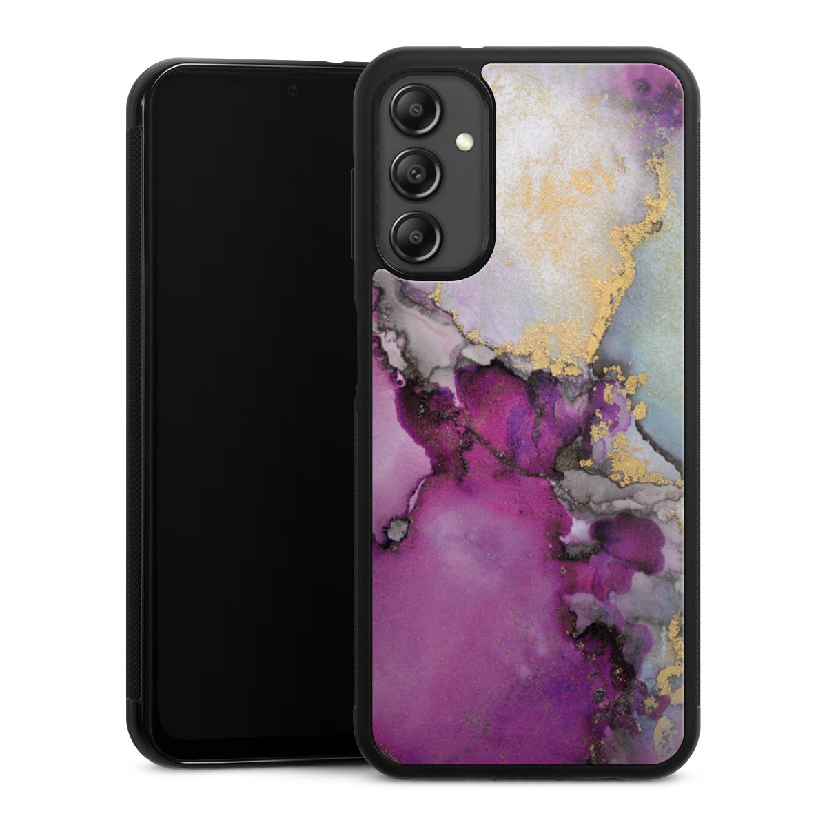 We print your design on the back of the glass inlay and then connect it firmly to the silicone case ,so that nothing sticks out and everything looks like it was cast from one piece. In addition, the sturdy glass element is protected from scratches by an additional coating and ensures a slight reflection on the shiny print image.