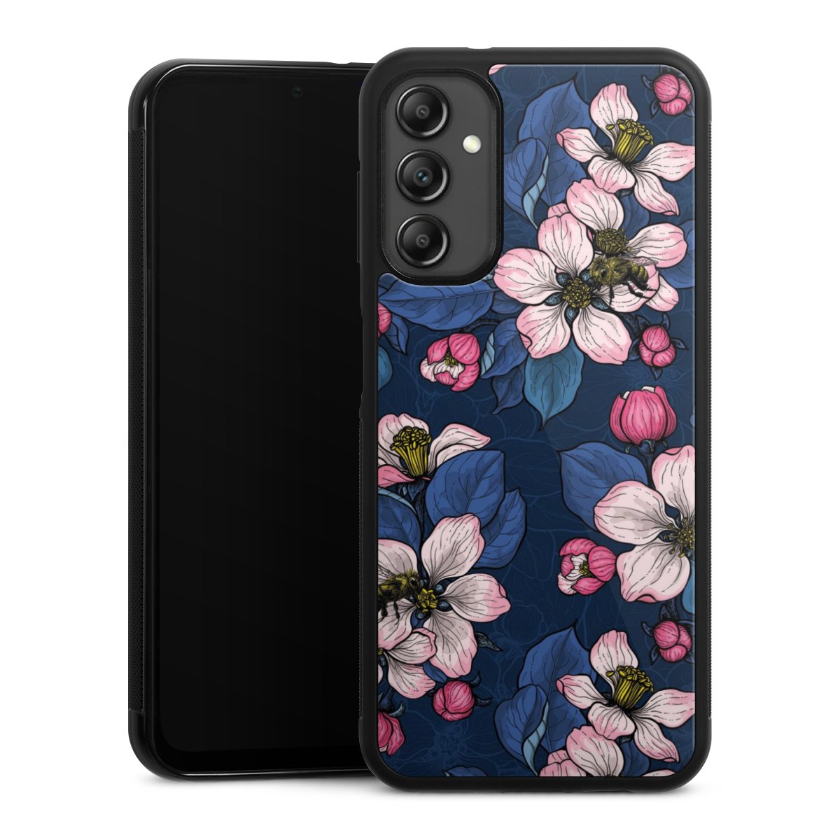 We print your design on the back of the glass inlay and then connect it firmly to the silicone case ,so that nothing sticks out and everything looks like it was cast from one piece. In addition, the sturdy glass element is protected from scratches by an additional coating and ensures a slight reflection on the shiny print image.