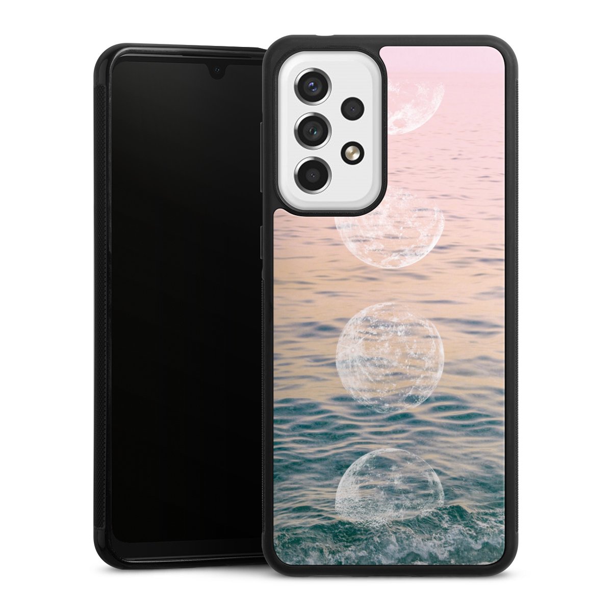We print your design on the back of the glass inlay and then connect it firmly to the silicone case ,so that nothing sticks out and everything looks like it was cast from one piece. In addition, the sturdy glass element is protected from scratches by an additional coating and ensures a slight reflection on the shiny print image.