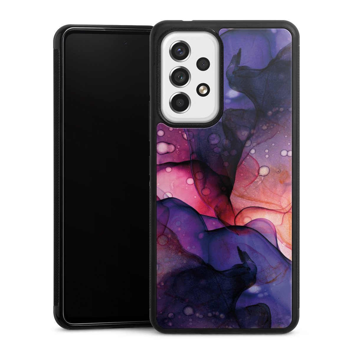We print your design on the back of the glass inlay and then connect it firmly to the silicone case ,so that nothing sticks out and everything looks like it was cast from one piece. In addition, the sturdy glass element is protected from scratches by an additional coating and ensures a slight reflection on the shiny print image.