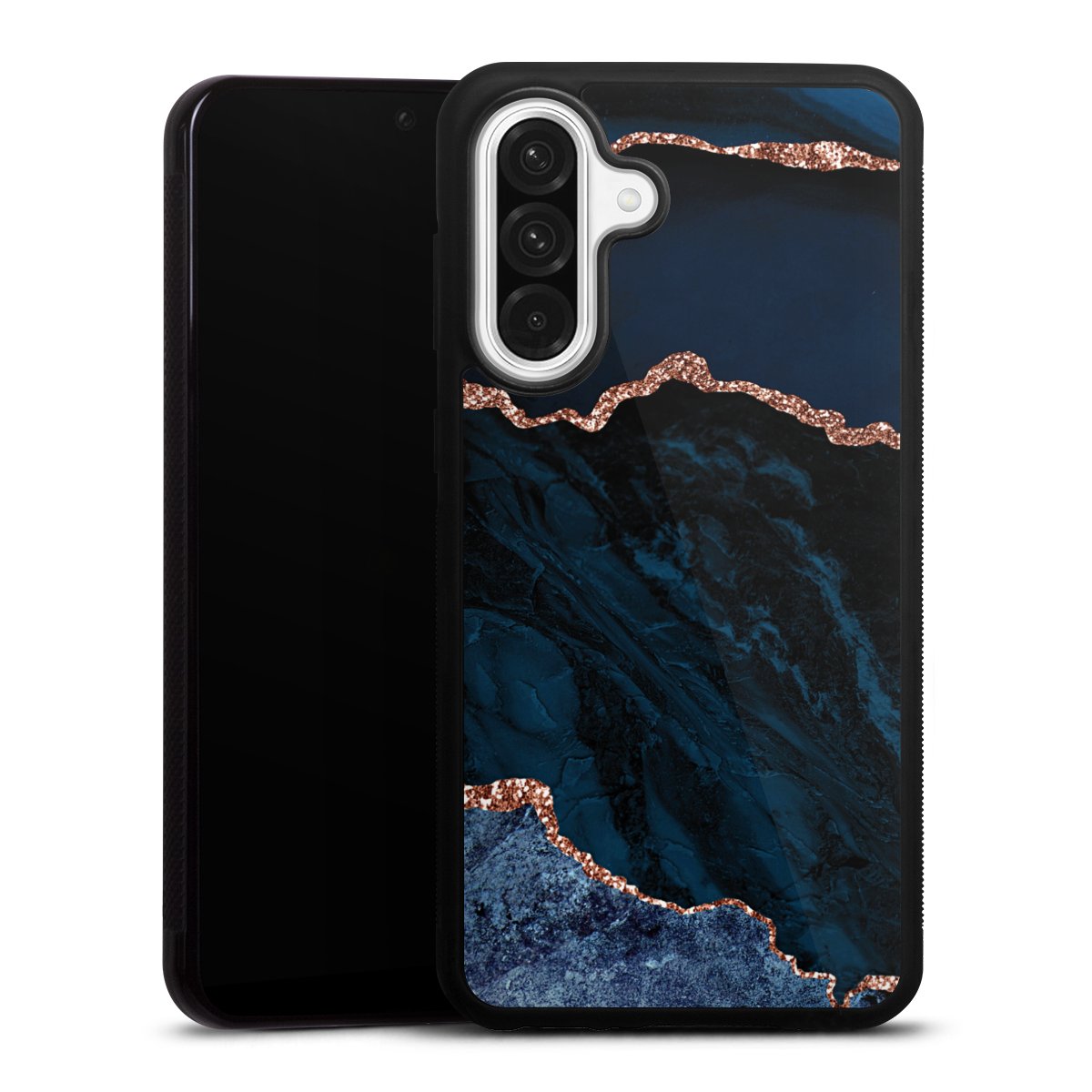 We print your design on the back of the glass inlay and then connect it firmly to the silicone case ,so that nothing sticks out and everything looks like it was cast from one piece. In addition, the sturdy glass element is protected from scratches by an additional coating and ensures a slight reflection on the shiny print image.