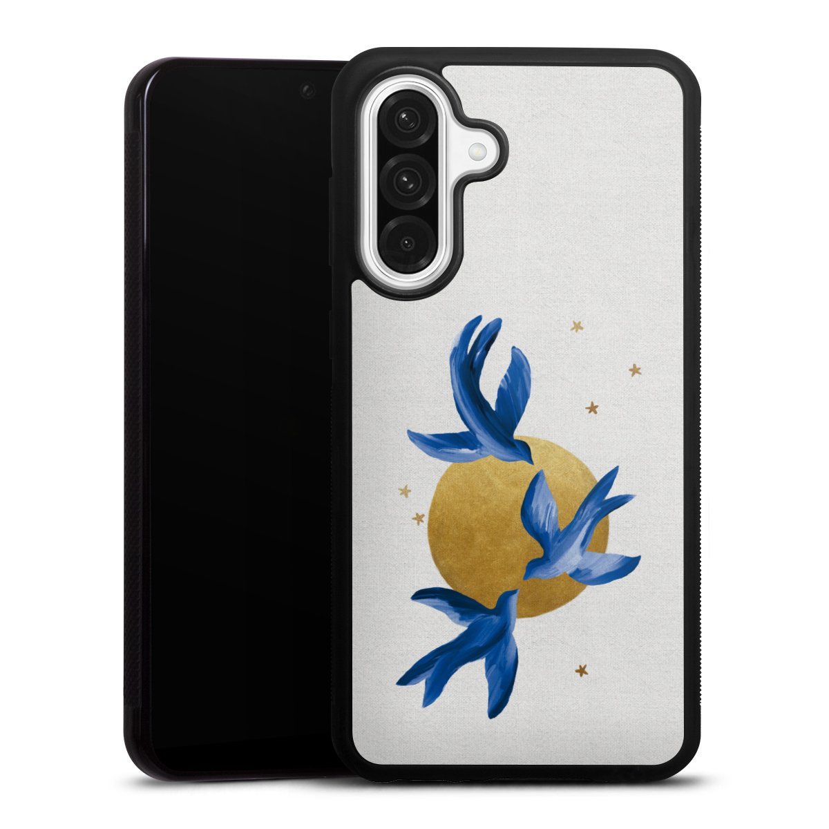 We print your design on the back of the glass inlay and then connect it firmly to the silicone case ,so that nothing sticks out and everything looks like it was cast from one piece. In addition, the sturdy glass element is protected from scratches by an additional coating and ensures a slight reflection on the shiny print image.