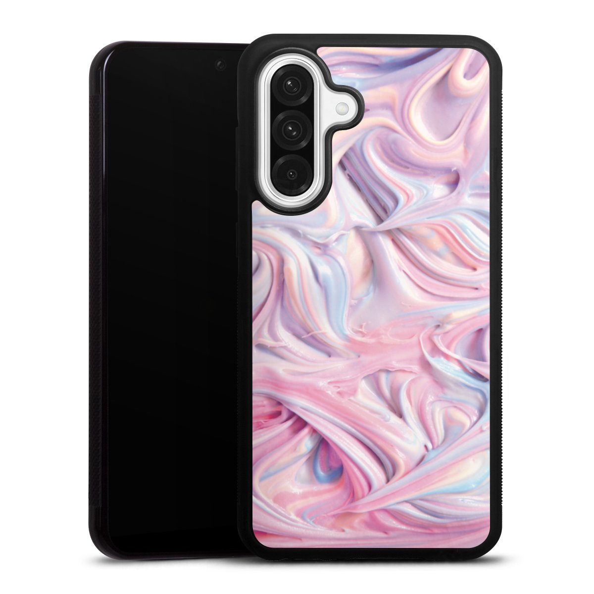We print your design on the back of the glass inlay and then connect it firmly to the silicone case ,so that nothing sticks out and everything looks like it was cast from one piece. In addition, the sturdy glass element is protected from scratches by an additional coating and ensures a slight reflection on the shiny print image.