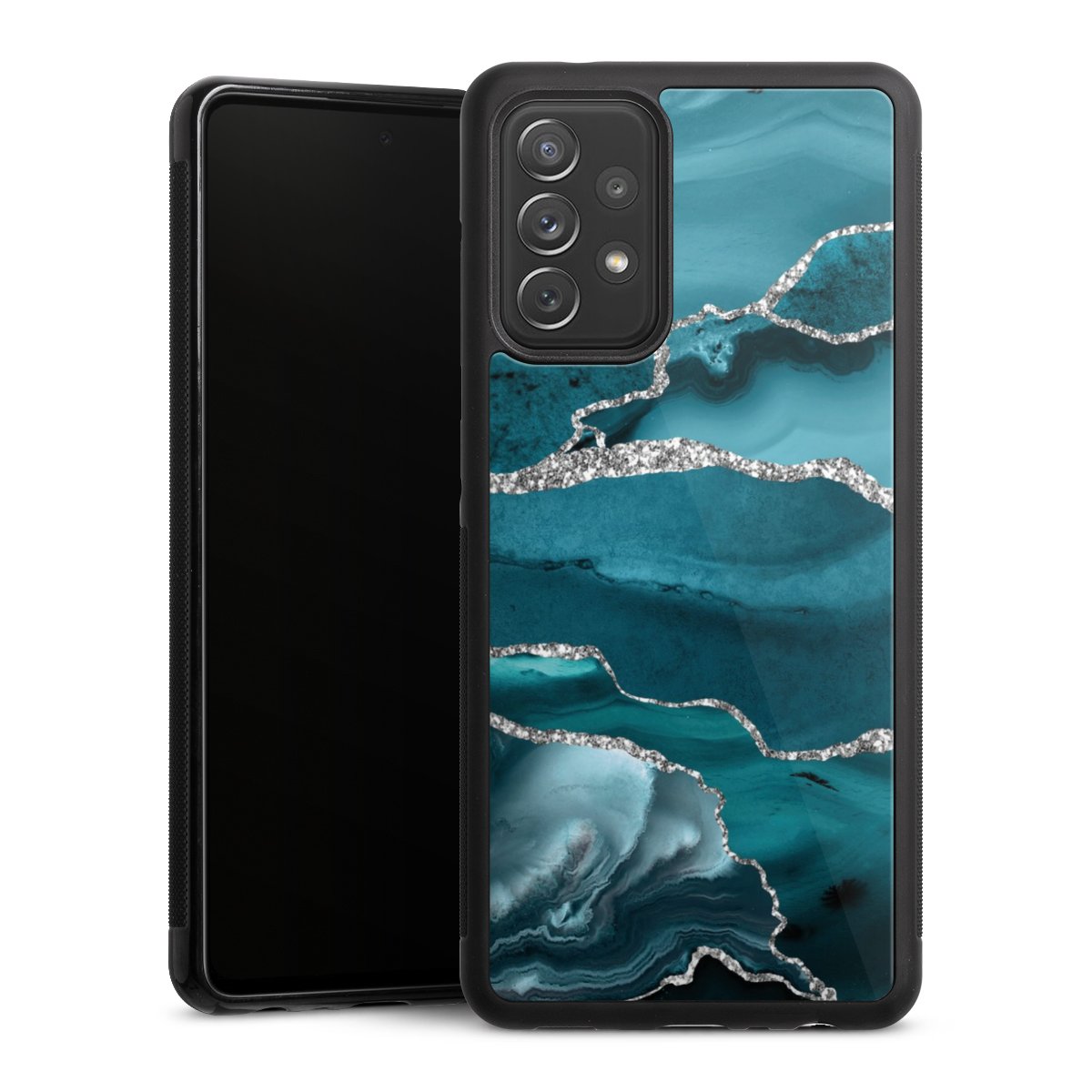 We print your design on the back of the glass inlay and then connect it firmly to the silicone case ,so that nothing sticks out and everything looks like it was cast from one piece. In addition, the sturdy glass element is protected from scratches by an additional coating and ensures a slight reflection on the shiny print image.