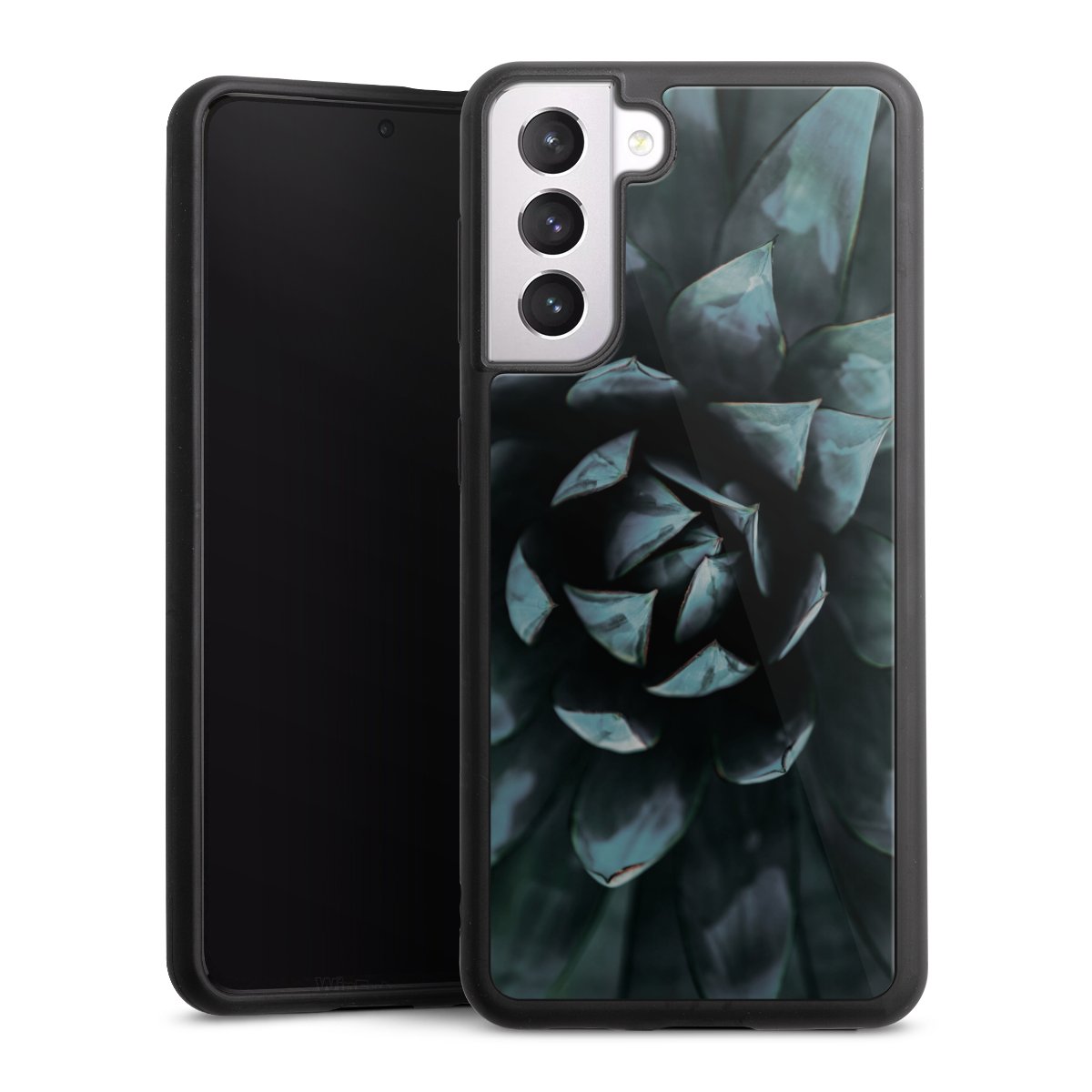 We print your design on the back of the glass inlay and then connect it firmly to the silicone case ,so that nothing sticks out and everything looks like it was cast from one piece. In addition, the sturdy glass element is protected from scratches by an additional coating and ensures a slight reflection on the shiny print image.