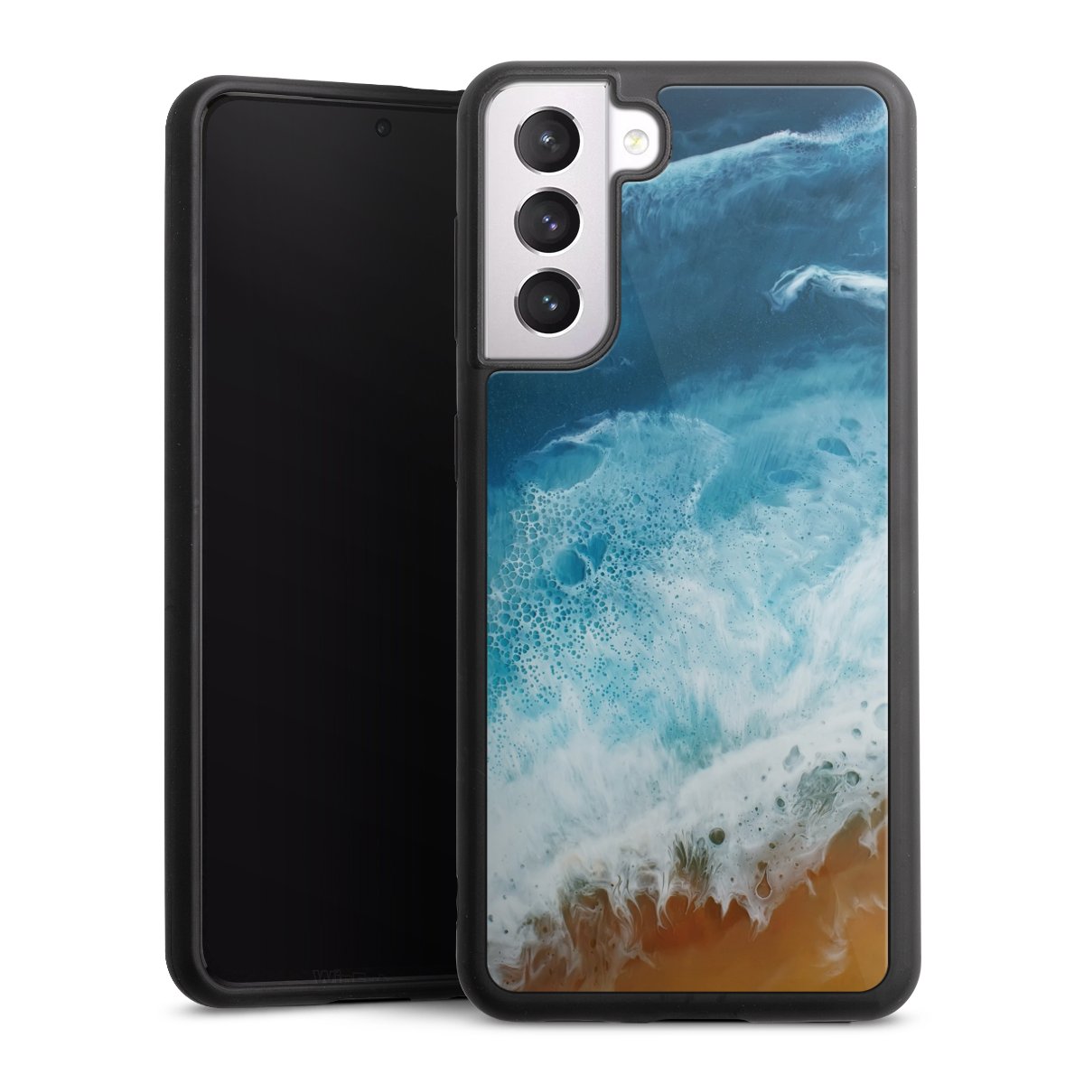 We print your design on the back of the glass inlay and then connect it firmly to the silicone case ,so that nothing sticks out and everything looks like it was cast from one piece. In addition, the sturdy glass element is protected from scratches by an additional coating and ensures a slight reflection on the shiny print image.