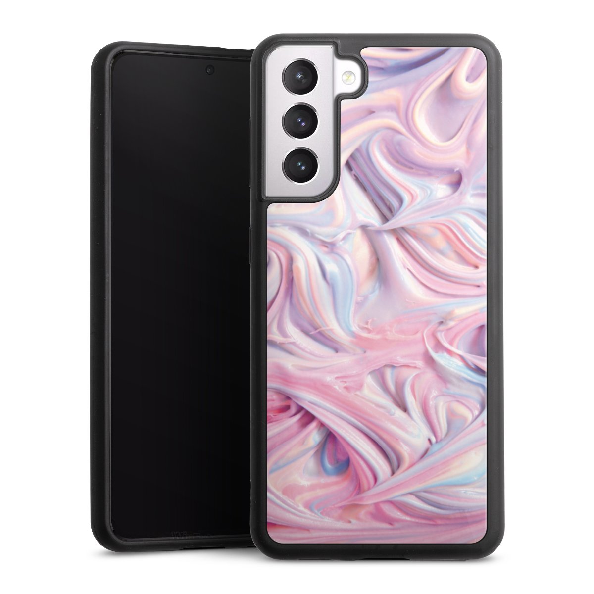 We print your design on the back of the glass inlay and then connect it firmly to the silicone case ,so that nothing sticks out and everything looks like it was cast from one piece. In addition, the sturdy glass element is protected from scratches by an additional coating and ensures a slight reflection on the shiny print image.
