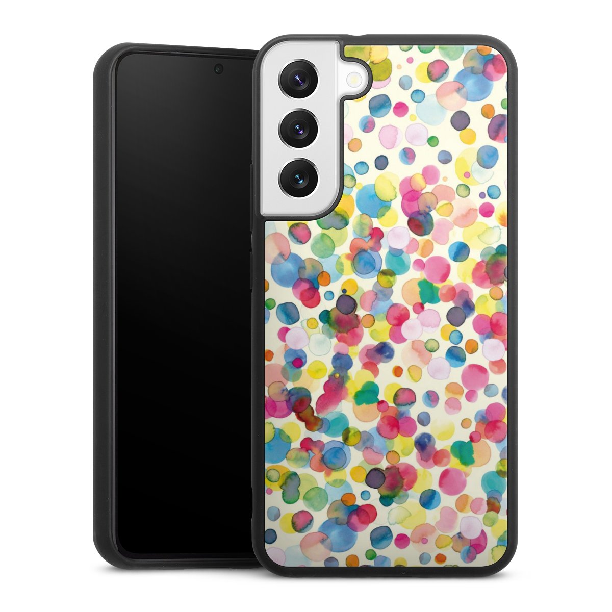 We print your design on the back of the glass inlay and then connect it firmly to the silicone case ,so that nothing sticks out and everything looks like it was cast from one piece. In addition, the sturdy glass element is protected from scratches by an additional coating and ensures a slight reflection on the shiny print image.