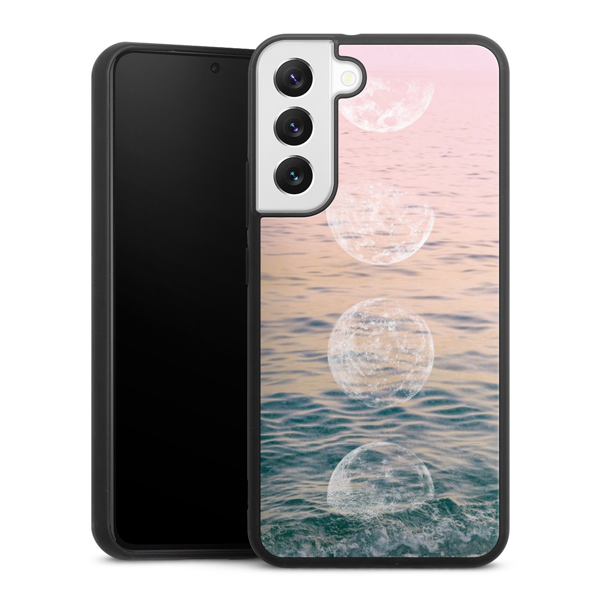 We print your design on the back of the glass inlay and then connect it firmly to the silicone case ,so that nothing sticks out and everything looks like it was cast from one piece. In addition, the sturdy glass element is protected from scratches by an additional coating and ensures a slight reflection on the shiny print image.