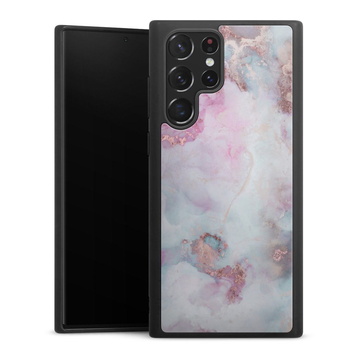 We print your design on the back of the glass inlay and then connect it firmly to the silicone case ,so that nothing sticks out and everything looks like it was cast from one piece. In addition, the sturdy glass element is protected from scratches by an additional coating and ensures a slight reflection on the shiny print image.