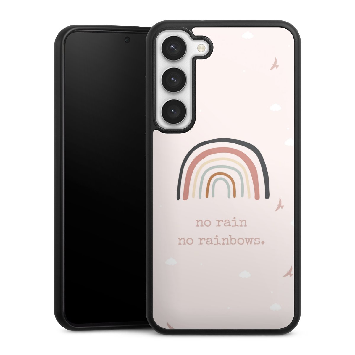 We print your design on the back of the glass inlay and then connect it firmly to the silicone case ,so that nothing sticks out and everything looks like it was cast from one piece. In addition, the sturdy glass element is protected from scratches by an additional coating and ensures a slight reflection on the shiny print image.