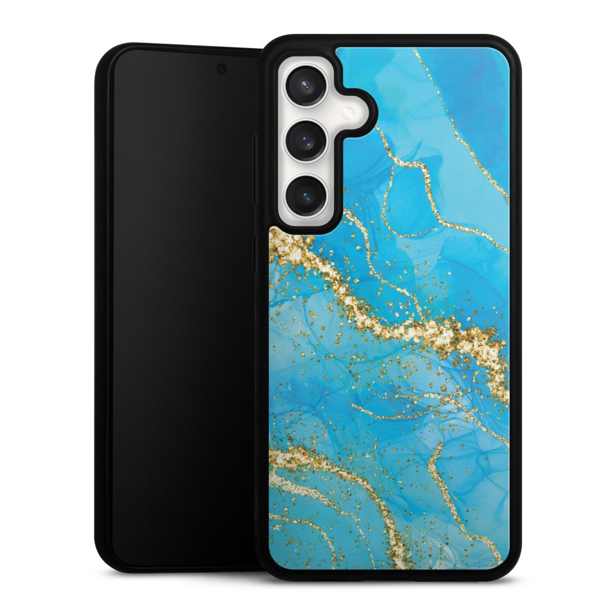 We print your design on the back of the glass inlay and then connect it firmly to the silicone case ,so that nothing sticks out and everything looks like it was cast from one piece. In addition, the sturdy glass element is protected from scratches by an additional coating and ensures a slight reflection on the shiny print image.