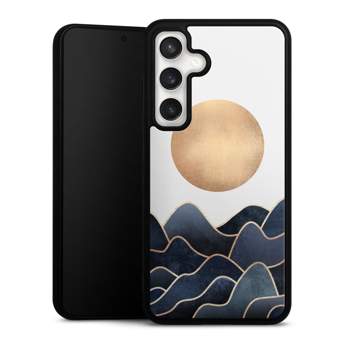 We print your design on the back of the glass inlay and then connect it firmly to the silicone case ,so that nothing sticks out and everything looks like it was cast from one piece. In addition, the sturdy glass element is protected from scratches by an additional coating and ensures a slight reflection on the shiny print image.