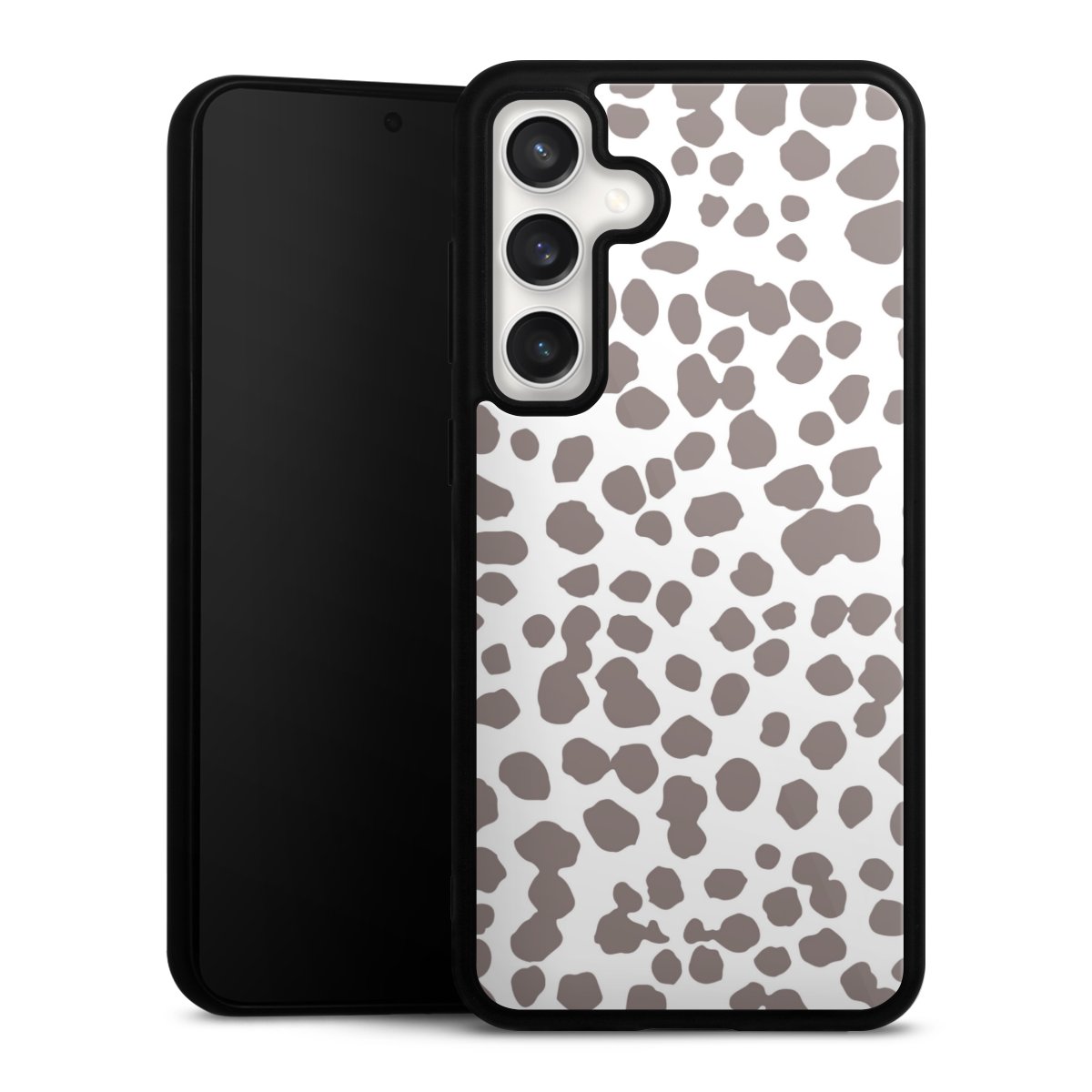 We print your design on the back of the glass inlay and then connect it firmly to the silicone case ,so that nothing sticks out and everything looks like it was cast from one piece. In addition, the sturdy glass element is protected from scratches by an additional coating and ensures a slight reflection on the shiny print image.