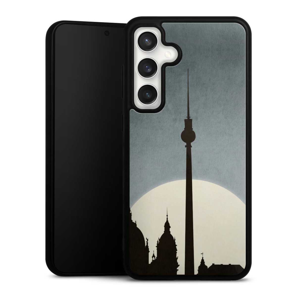 We print your design on the back of the glass inlay and then connect it firmly to the silicone case ,so that nothing sticks out and everything looks like it was cast from one piece. In addition, the sturdy glass element is protected from scratches by an additional coating and ensures a slight reflection on the shiny print image.