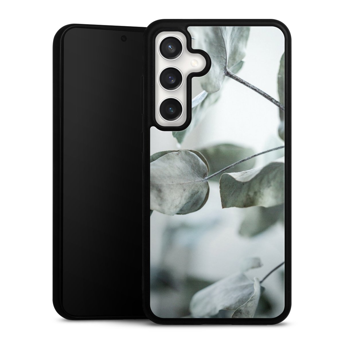 We print your design on the back of the glass inlay and then connect it firmly to the silicone case ,so that nothing sticks out and everything looks like it was cast from one piece. In addition, the sturdy glass element is protected from scratches by an additional coating and ensures a slight reflection on the shiny print image.