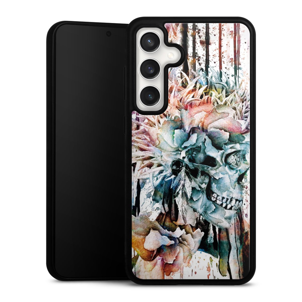 We print your design on the back of the glass inlay and then connect it firmly to the silicone case ,so that nothing sticks out and everything looks like it was cast from one piece. In addition, the sturdy glass element is protected from scratches by an additional coating and ensures a slight reflection on the shiny print image.