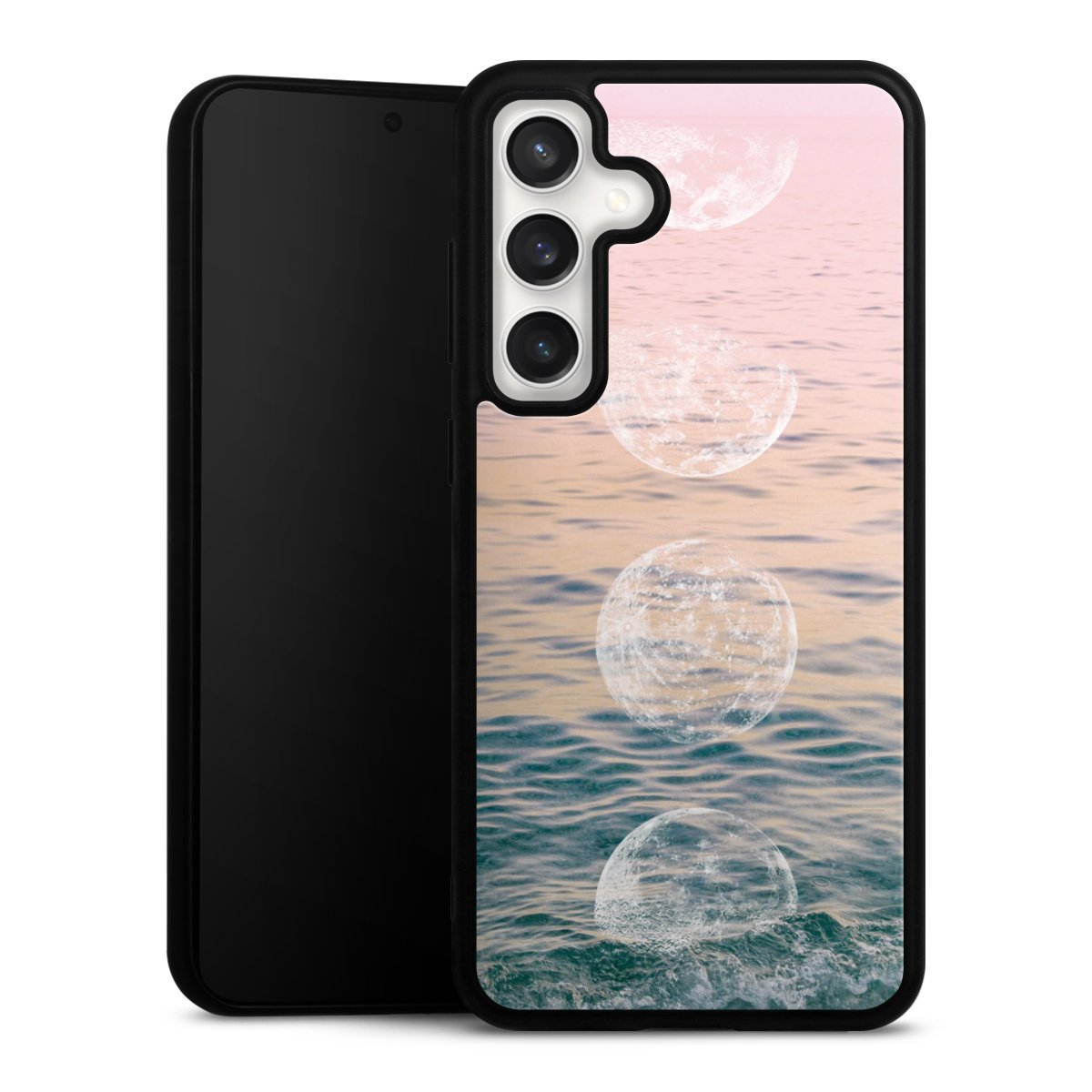 We print your design on the back of the glass inlay and then connect it firmly to the silicone case ,so that nothing sticks out and everything looks like it was cast from one piece. In addition, the sturdy glass element is protected from scratches by an additional coating and ensures a slight reflection on the shiny print image.