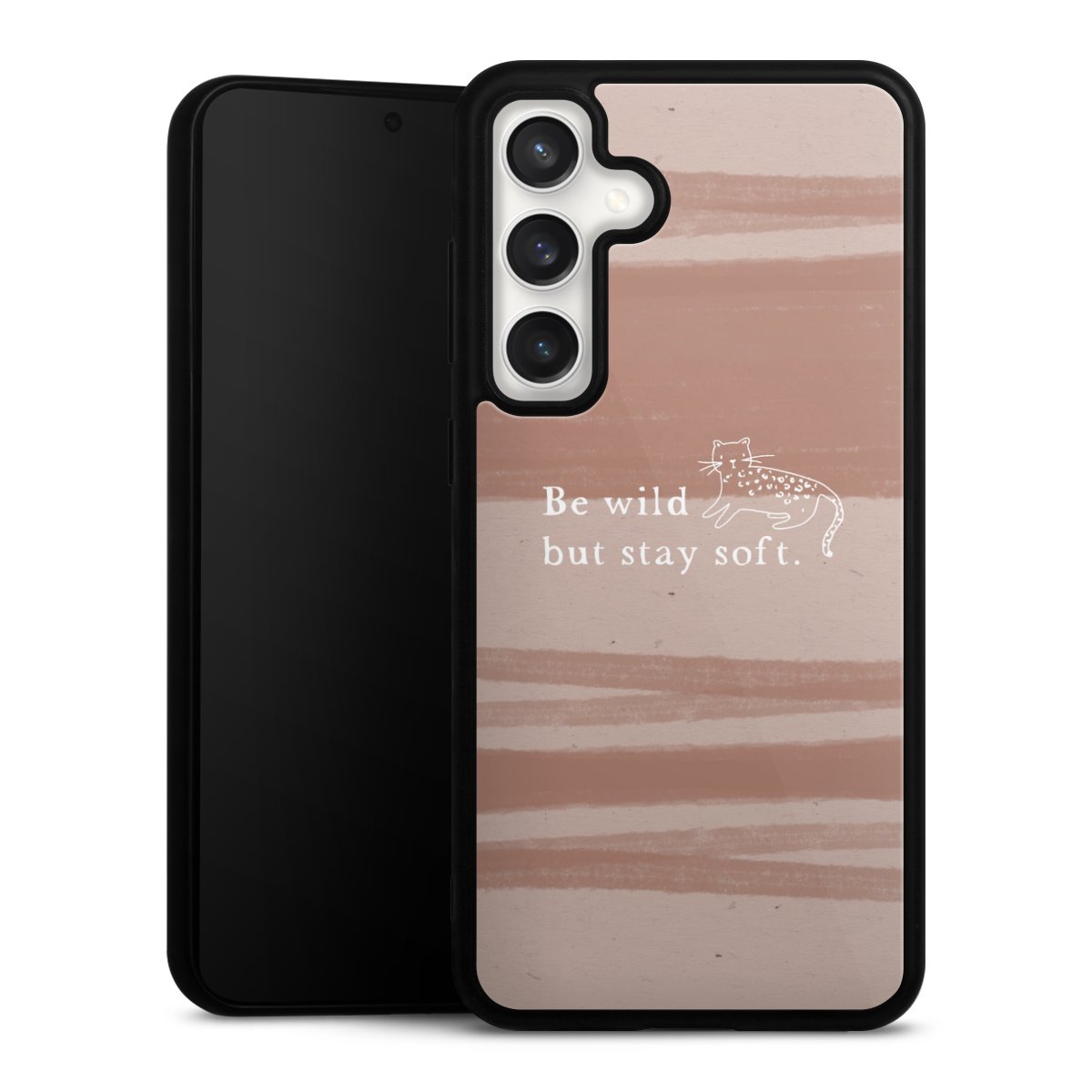 We print your design on the back of the glass inlay and then connect it firmly to the silicone case ,so that nothing sticks out and everything looks like it was cast from one piece. In addition, the sturdy glass element is protected from scratches by an additional coating and ensures a slight reflection on the shiny print image.