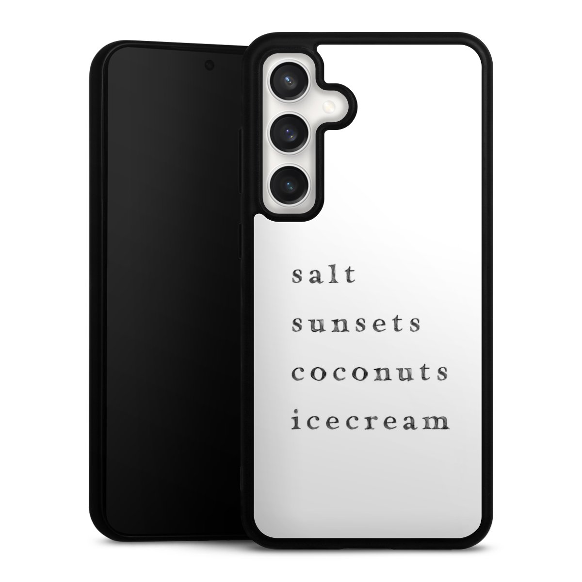 We print your design on the back of the glass inlay and then connect it firmly to the silicone case ,so that nothing sticks out and everything looks like it was cast from one piece. In addition, the sturdy glass element is protected from scratches by an additional coating and ensures a slight reflection on the shiny print image.