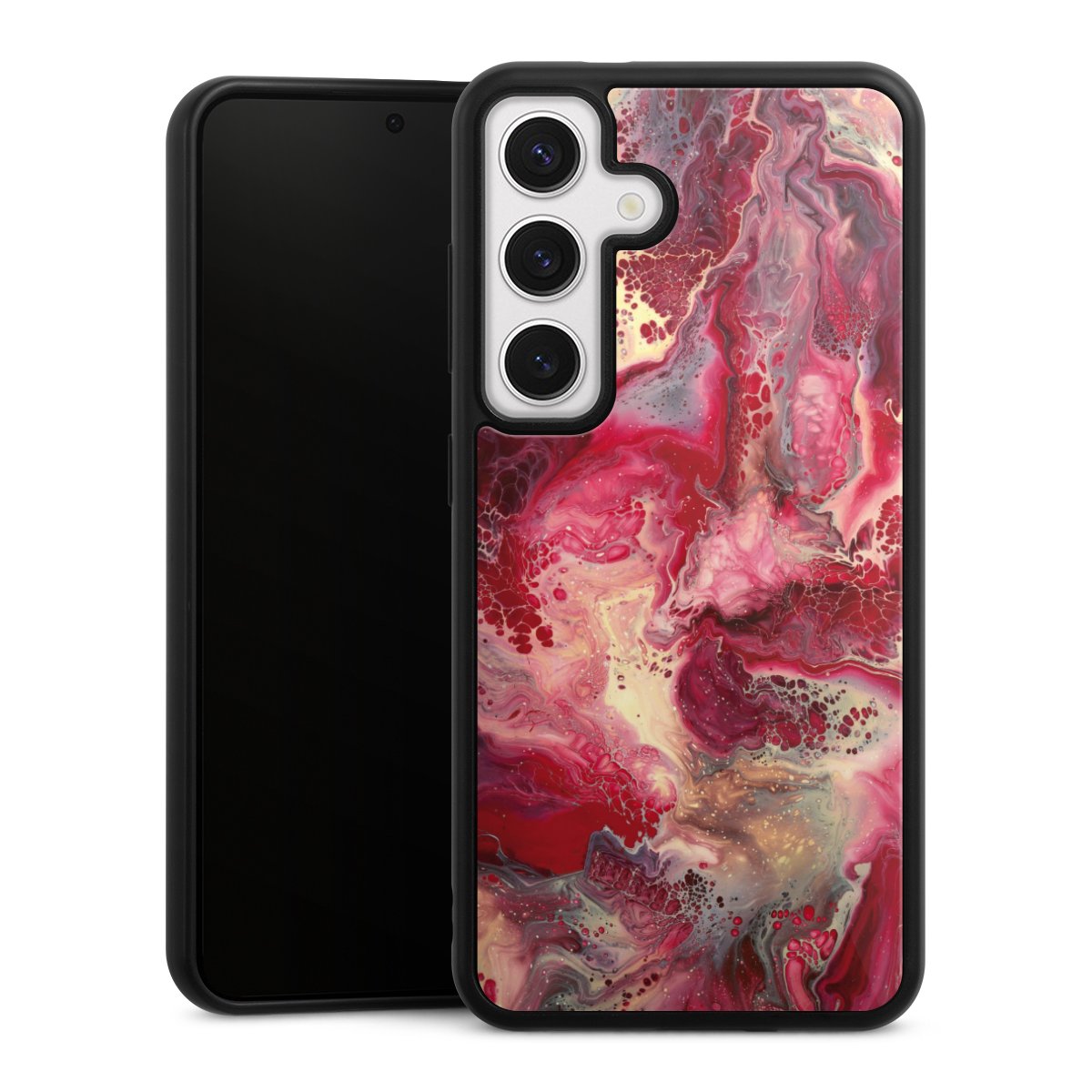 We print your design on the back of the glass inlay and then connect it firmly to the silicone case ,so that nothing sticks out and everything looks like it was cast from one piece. In addition, the sturdy glass element is protected from scratches by an additional coating and ensures a slight reflection on the shiny print image.
