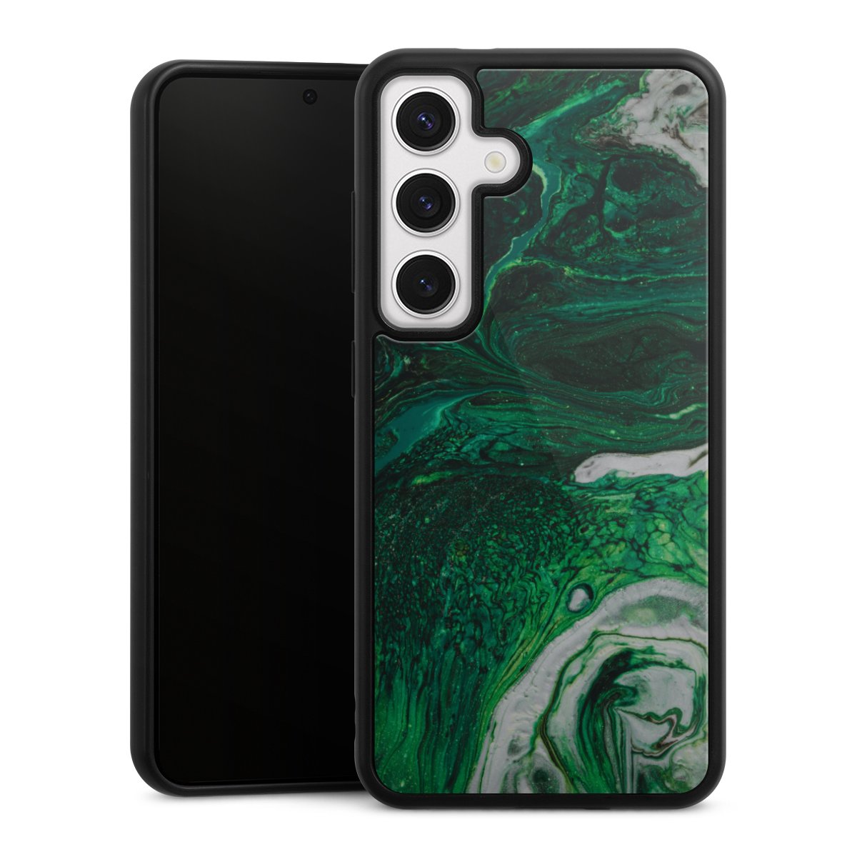 We print your design on the back of the glass inlay and then connect it firmly to the silicone case ,so that nothing sticks out and everything looks like it was cast from one piece. In addition, the sturdy glass element is protected from scratches by an additional coating and ensures a slight reflection on the shiny print image.