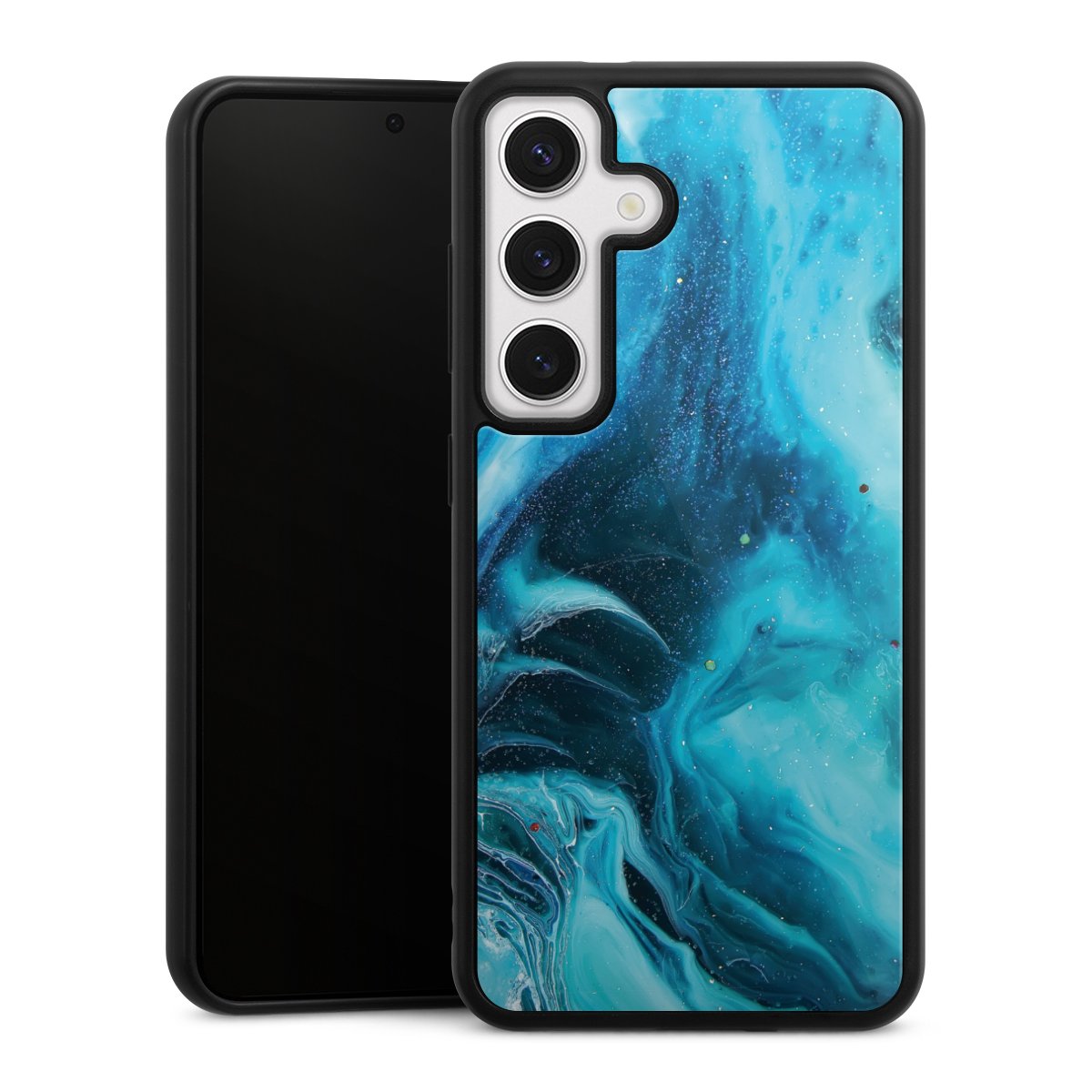 We print your design on the back of the glass inlay and then connect it firmly to the silicone case ,so that nothing sticks out and everything looks like it was cast from one piece. In addition, the sturdy glass element is protected from scratches by an additional coating and ensures a slight reflection on the shiny print image.