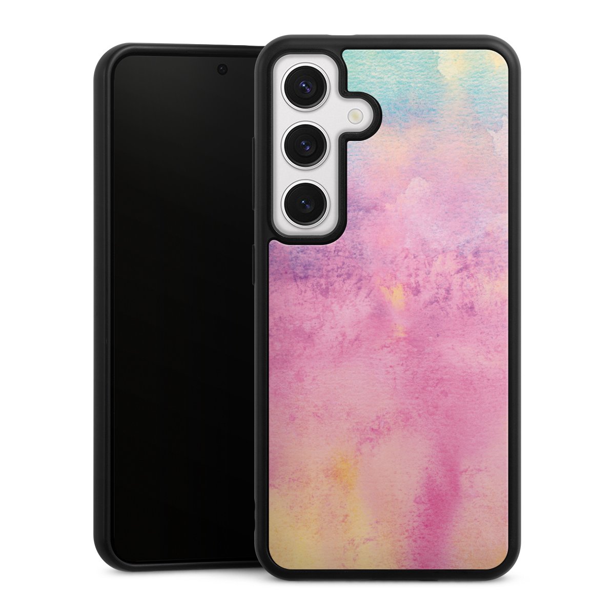 We print your design on the back of the glass inlay and then connect it firmly to the silicone case ,so that nothing sticks out and everything looks like it was cast from one piece. In addition, the sturdy glass element is protected from scratches by an additional coating and ensures a slight reflection on the shiny print image.