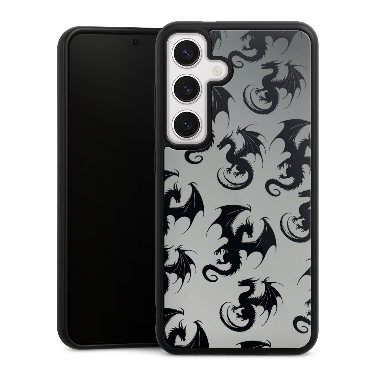 We print your design on the back of the glass inlay and then connect it firmly to the silicone case ,so that nothing sticks out and everything looks like it was cast from one piece. In addition, the sturdy glass element is protected from scratches by an additional coating and ensures a slight reflection on the shiny print image.