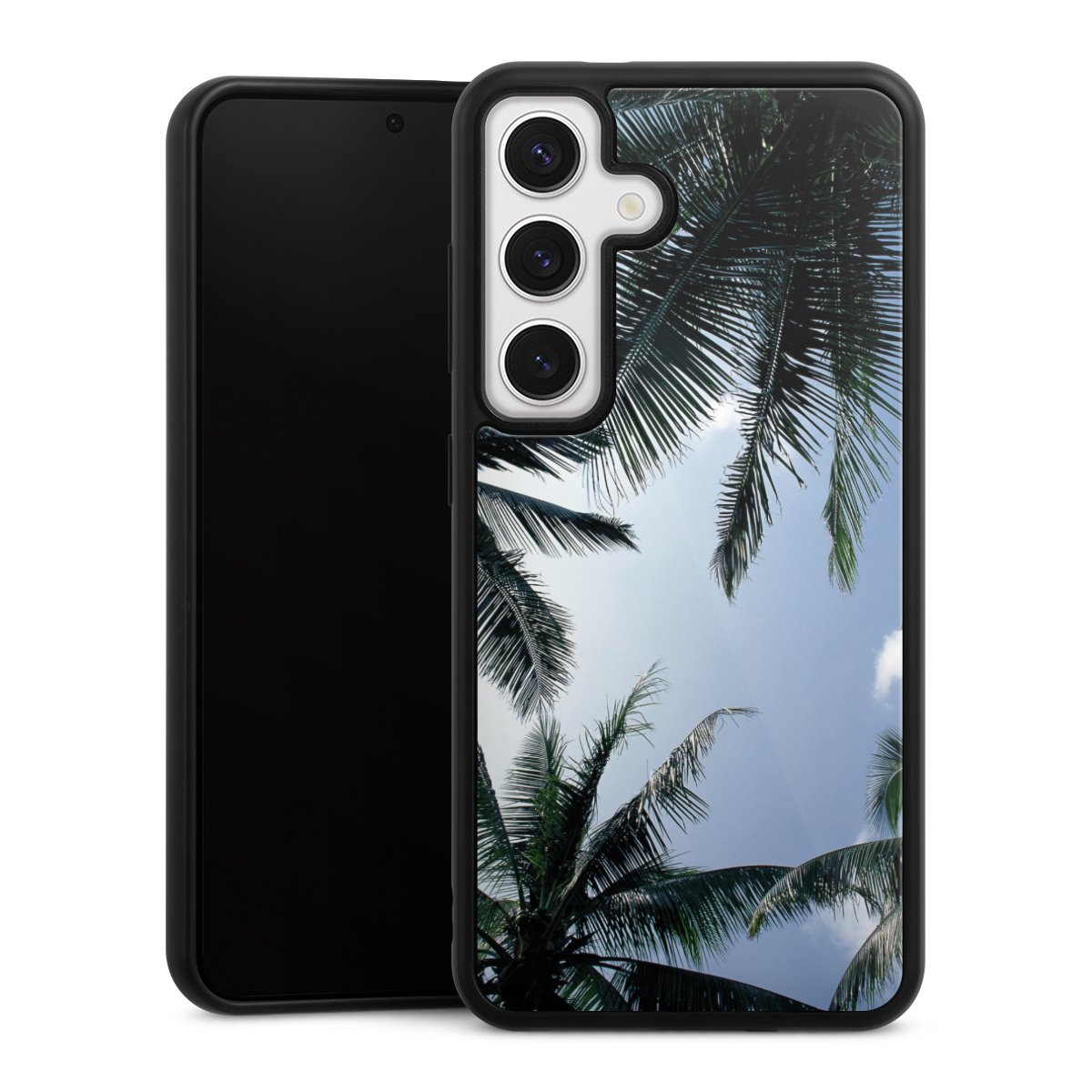 We print your design on the back of the glass inlay and then connect it firmly to the silicone case ,so that nothing sticks out and everything looks like it was cast from one piece. In addition, the sturdy glass element is protected from scratches by an additional coating and ensures a slight reflection on the shiny print image.