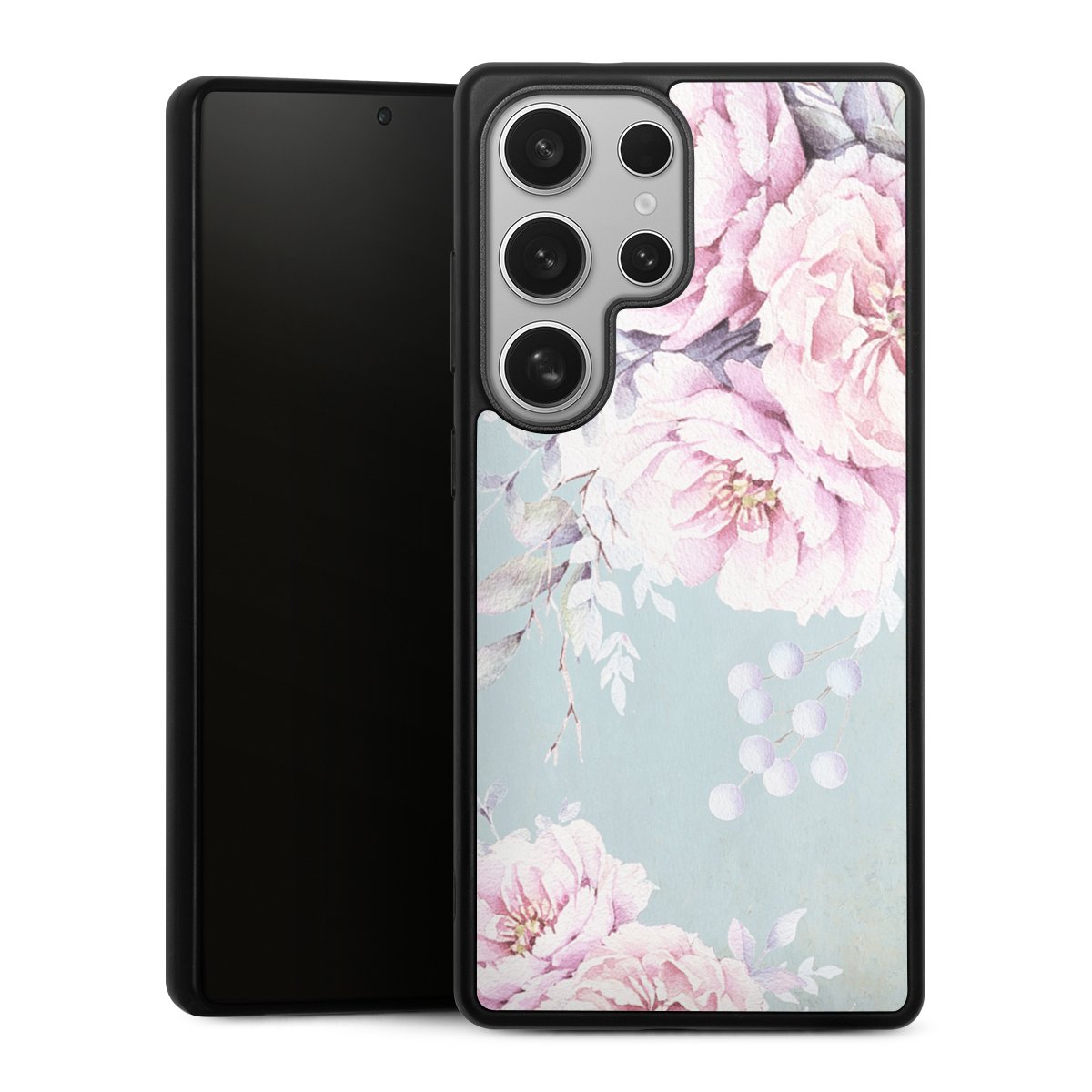 We print your design on the back of the glass inlay and then connect it firmly to the silicone case ,so that nothing sticks out and everything looks like it was cast from one piece. In addition, the sturdy glass element is protected from scratches by an additional coating and ensures a slight reflection on the shiny print image.