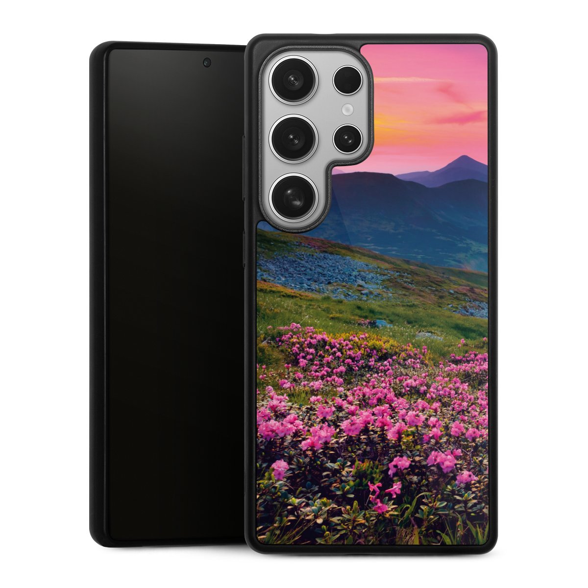 We print your design on the back of the glass inlay and then connect it firmly to the silicone case ,so that nothing sticks out and everything looks like it was cast from one piece. In addition, the sturdy glass element is protected from scratches by an additional coating and ensures a slight reflection on the shiny print image.