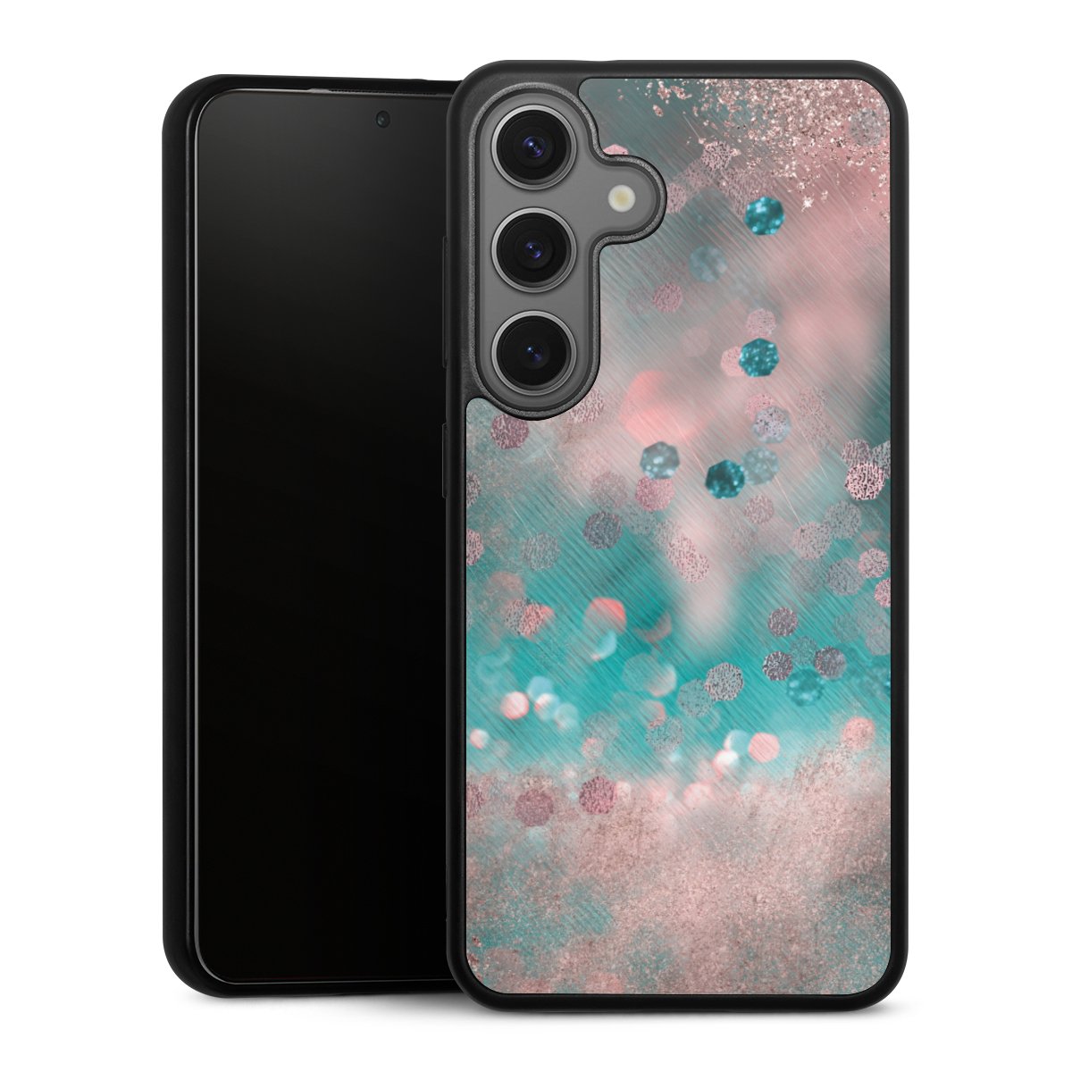 We print your design on the back of the glass inlay and then connect it firmly to the silicone case ,so that nothing sticks out and everything looks like it was cast from one piece. In addition, the sturdy glass element is protected from scratches by an additional coating and ensures a slight reflection on the shiny print image.