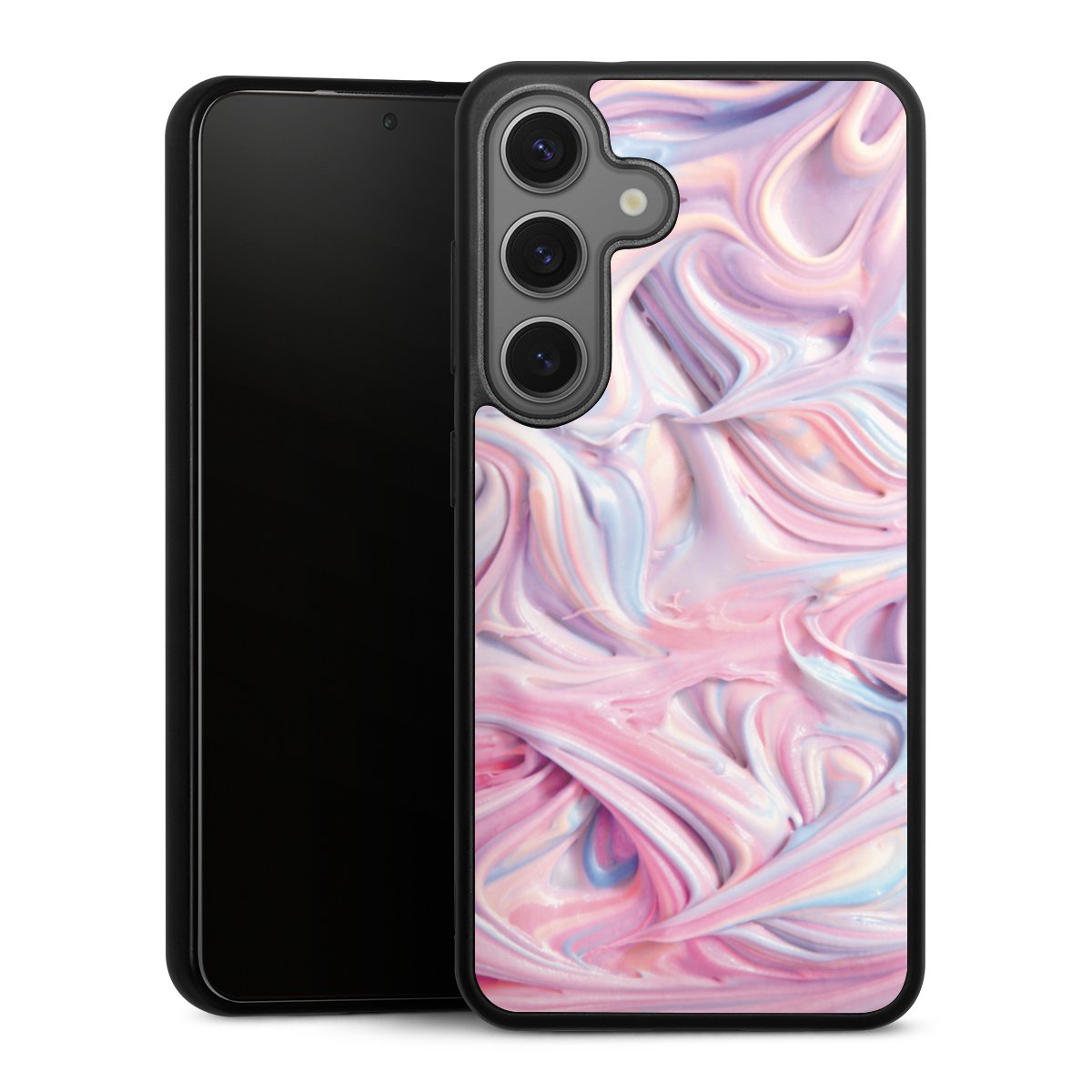 We print your design on the back of the glass inlay and then connect it firmly to the silicone case ,so that nothing sticks out and everything looks like it was cast from one piece. In addition, the sturdy glass element is protected from scratches by an additional coating and ensures a slight reflection on the shiny print image.