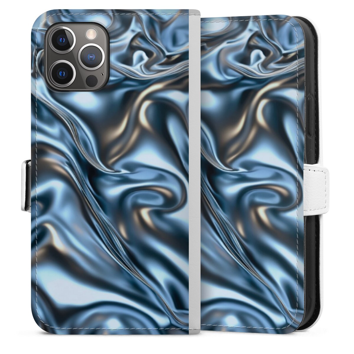 For our Sideflip Case we are using our advanced direct printing technology. The back and frontside are fully printabale, the inside of the phone bag is left unprinted. You can order the phone case without print, printed completely or also with a partial print.