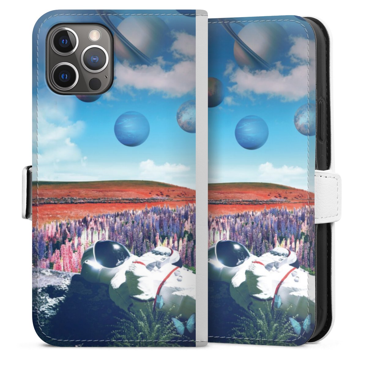 For our Sideflip Case we are using our advanced direct printing technology. The back and frontside are fully printabale, the inside of the phone bag is left unprinted. You can order the phone case without print, printed completely or also with a partial print.