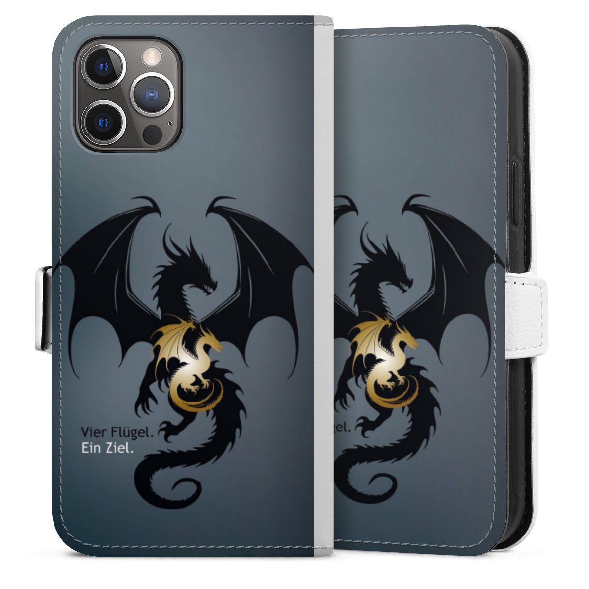 For our Sideflip Case we are using our advanced direct printing technology. The back and frontside are fully printabale, the inside of the phone bag is left unprinted. You can order the phone case without print, printed completely or also with a partial print.