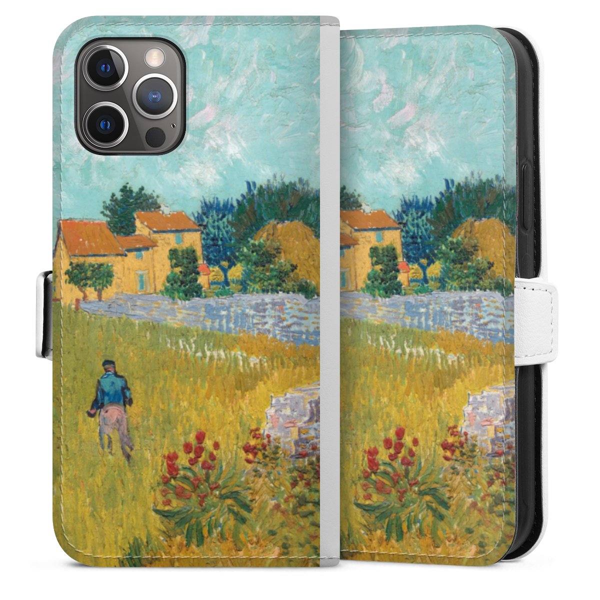 For our Sideflip Case we are using our advanced direct printing technology. The back and frontside are fully printabale, the inside of the phone bag is left unprinted. You can order the phone case without print, printed completely or also with a partial print.