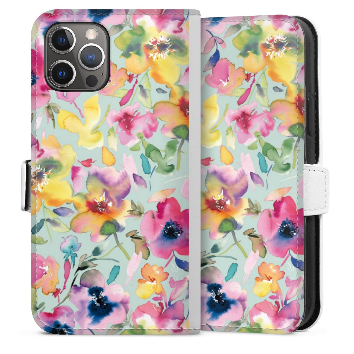For our Sideflip Case we are using our advanced direct printing technology. The back and frontside are fully printabale, the inside of the phone bag is left unprinted. You can order the phone case without print, printed completely or also with a partial print.